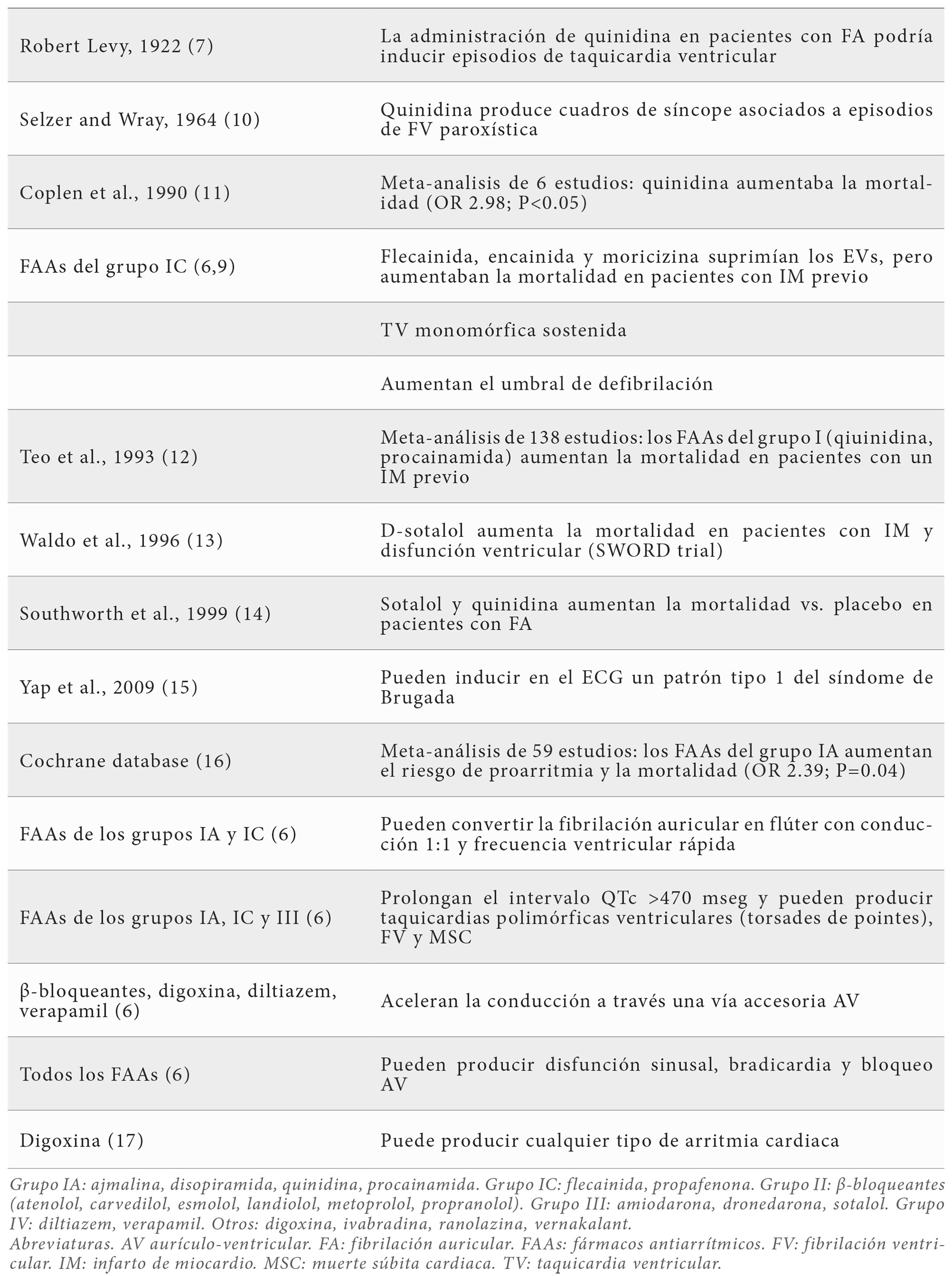 Los fármacos antiarrítmicos (FAAs) se utilizan para aliviar los síntomas, reducir las complicaciones (accidentes cerebrovasculares, insuficiencia cardiaca, hospitalizaciones, mortalidad) y mejorar la calidad de vida del paciente, tanto por suprimir o reducir la frecuencia de la arritmia, como por prevenir su recurrencia (6). Sin embargo, los FAAs son poco efectivos para controlar las arritmias cardiacas y, paradójicamente, pueden inducir y/o perpetuar las arritmias del paciente (6-10,11,12,13,14,15,16,17) (Tabla 1) lo que dificulta su manejo en la clínica diaria (6).