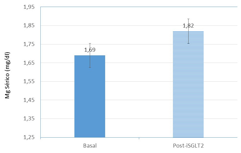 Figura 1. Representación gráfica de la evolución de las cifras de magnesio sérico antes y 6 meses después del inicio de tratamiento con iSGLT2. (medias e intervalo de confianza al 95%).