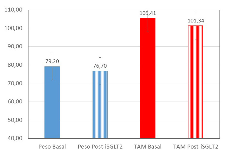 Figura 2. Representación gráfica de la evolución del peso (Kg) y tensión arterial media (TAM) (mmHg) antes y 6 meses después del inicio de tratamiento con iSGLT2. (medias e intervalo de confianza al 95%).
