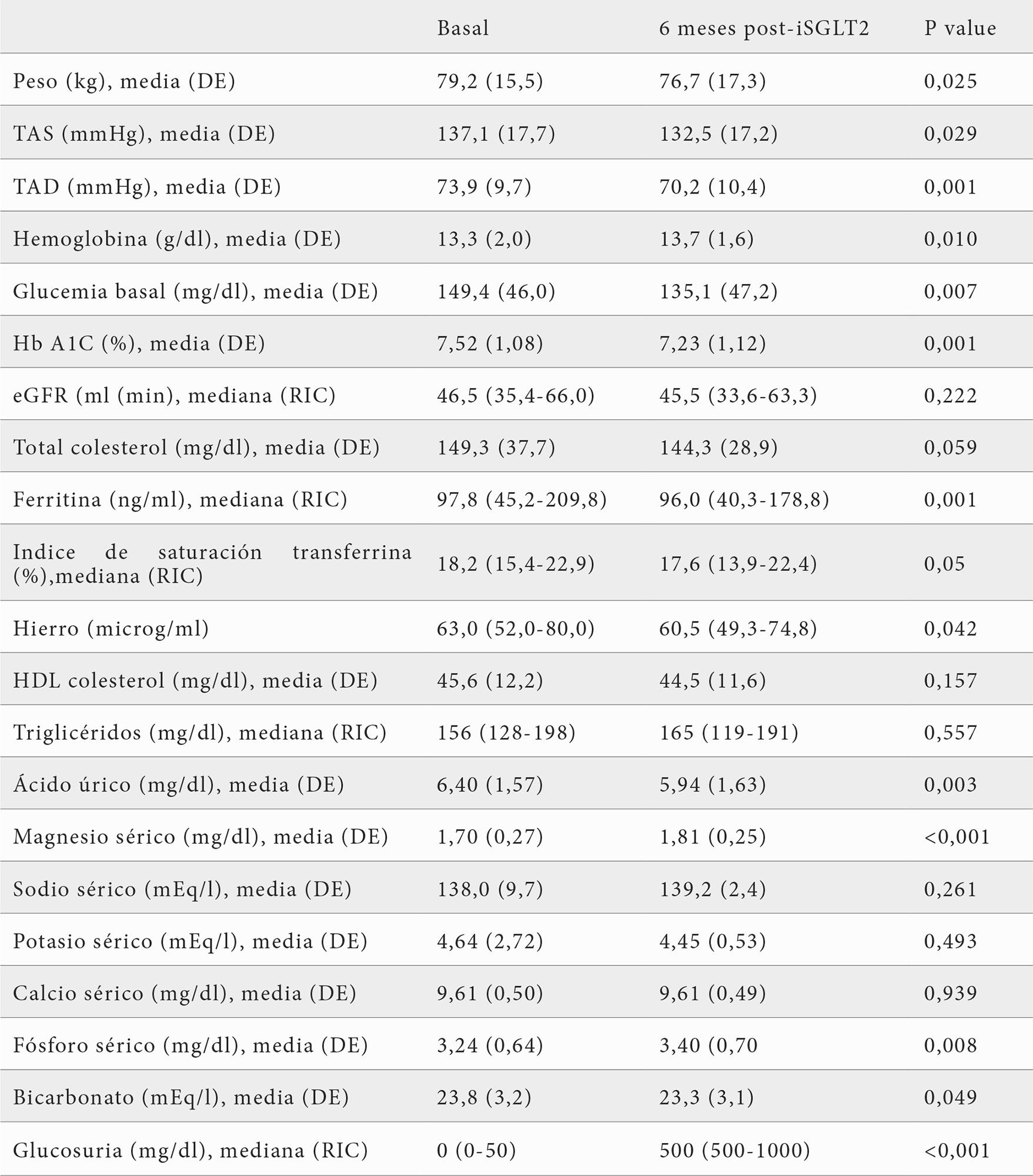Tabla 1. Comparaciones por pares entre los datos registrados al inicio del estudio y a los 6 meses posteriores al inicio del tratamiento con inhibidores de SGLT2.