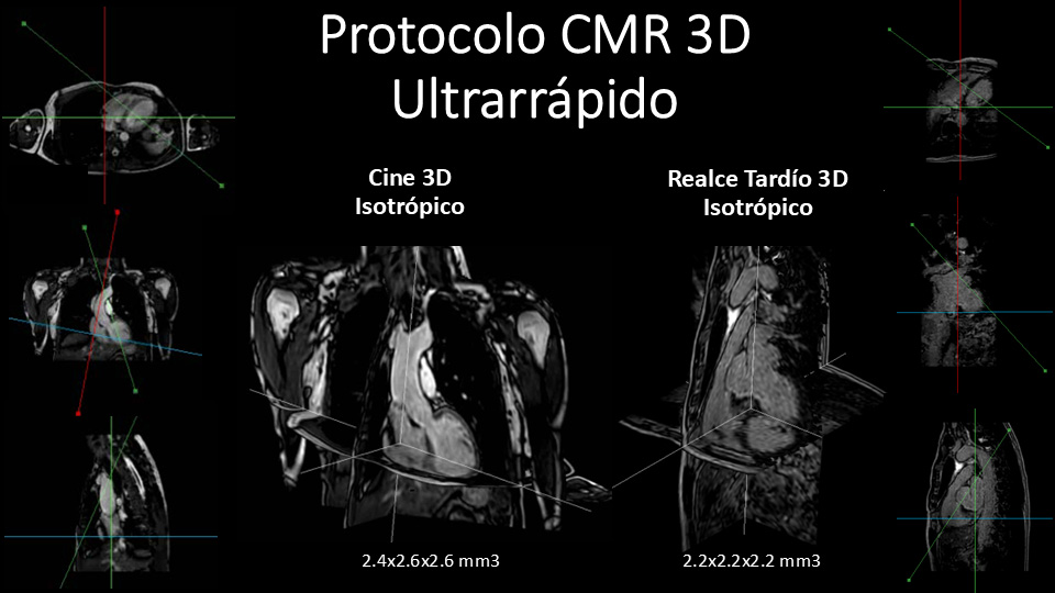 Esta dificultad abre el camino a explorar protocolos rápidos de adquisición. En los últimos años se han desarrollado técnicas que permiten la adquisición de volúmenes 3D isotrópicos en una sola apnea (figura 1), eliminando la necesidad de buscar las orientaciones del músculo cardiaco durante la adquisición. Esto simplifica drásticamente tanto los estudios de cine como los de realce tardío. Estas técnicas se han validado en una cohorte de más de 120 pacientes de distintas patologías cardiacas (3) y aórticas (5) demostrando una gran concordancia con la metodología convencional 2D en la cuantificación de la fracción de eyección tanto del ventrículo izquierdo (FEVI) como del derecho y del volumen de escara en estudios de realce tardío.