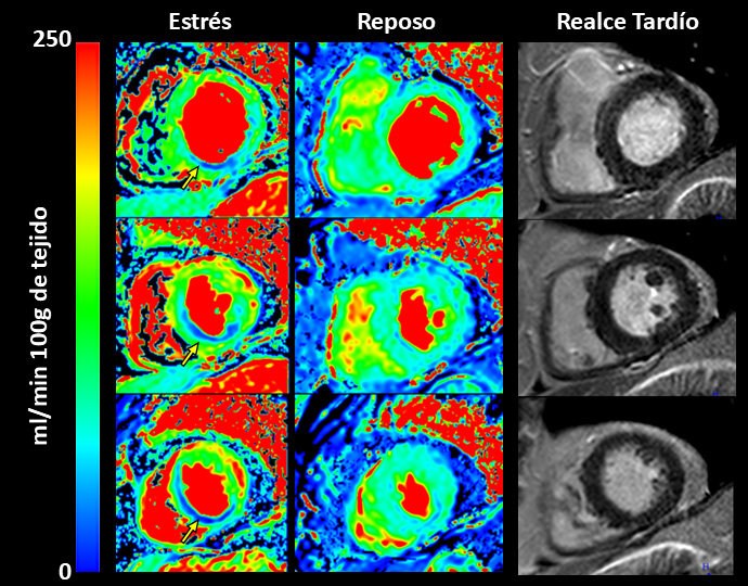 Figura 2. Ejemplo de los mapas de perfusión cuantitativa estrés(derecha) y reposo (centro) y la adquisición del realce tardío (izquierda) en 3 cortes distintos donde se puede apreciar claramente una falta de perfusión endocárdica en el estudio de estrés en los segmentos inferiores, inferoseptales y septales en los cortes basales, medios y apicales. Es defecto es menos presente en el estudio de perfusión en reposo y todavía no existe zonas de escara en el estudio de realce tardío.